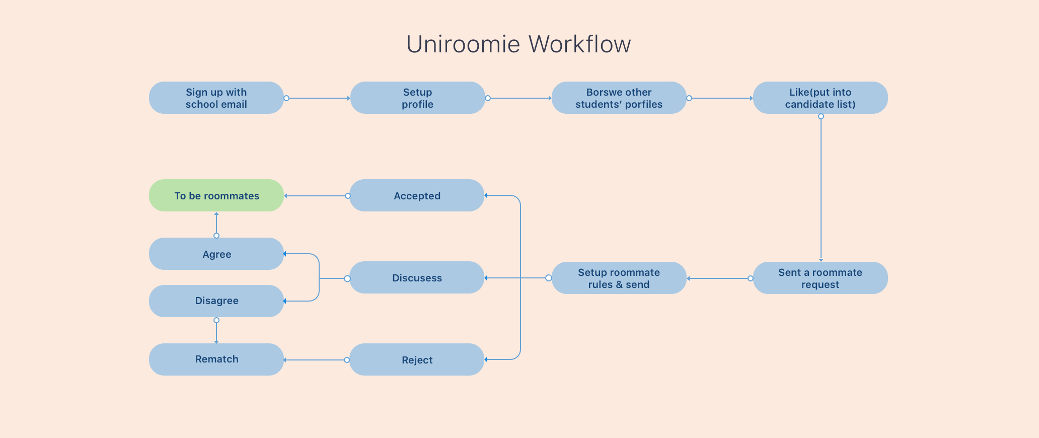 The porject team tries to iterate the user testing by using the media fidelity prototype. Meanwhile, this team is interested in holding a school housing department stuff interview, so that they can figure it out on how to transfer all the matching data to school. Moreover, some other information such as the optimized number of students in one dorm for harmony roommate relationship will be further explored too.