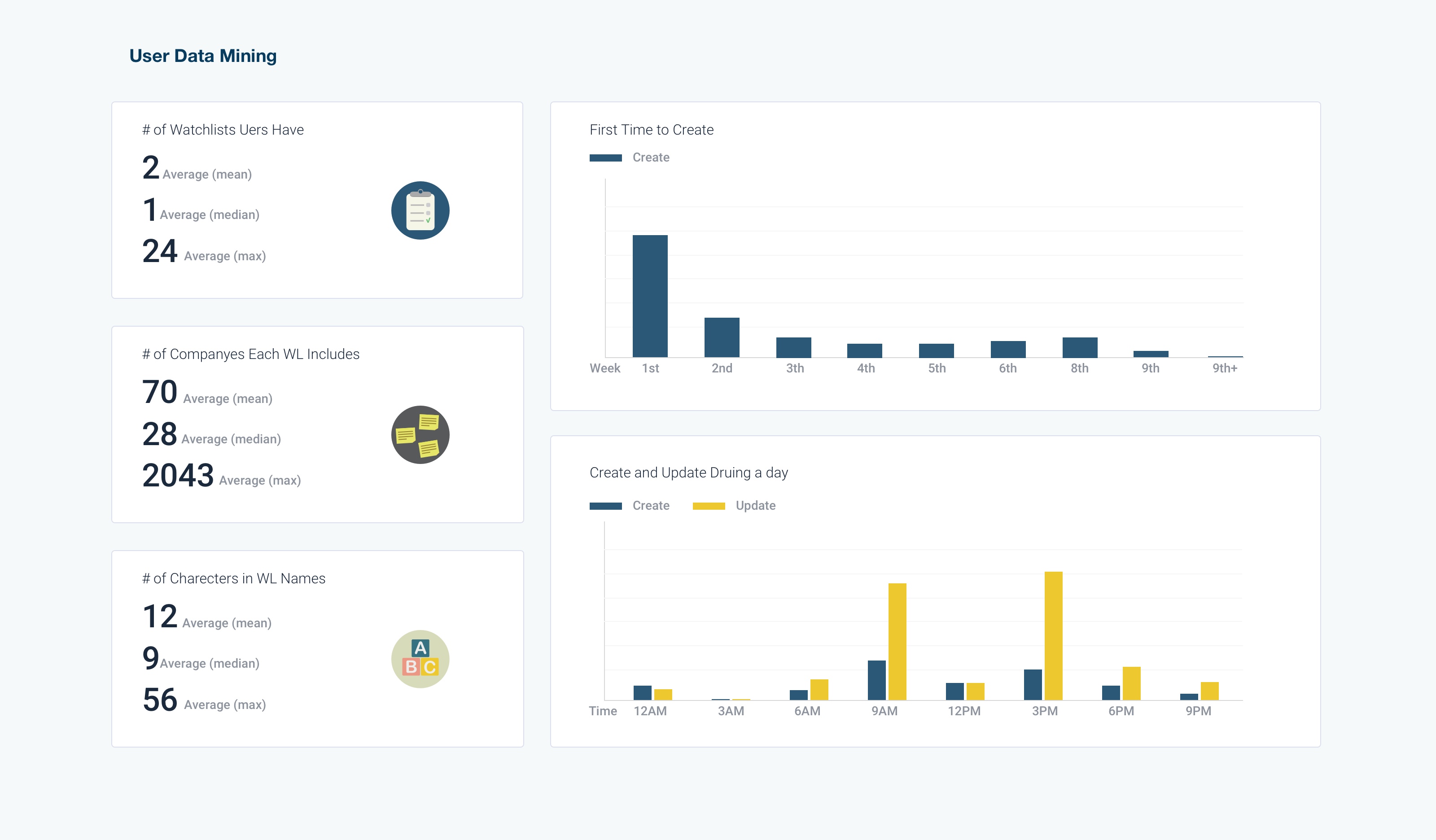 I data-mined our database and tried to understand the user's behavior patterns from three perspectives. One, How many watchlists did active users had? When and how it happened? Second, How many companies did they put into one watchlist? What were the attributes these companies shared? The last one is how did our clients name their watchlist, was any hints from these names telling me how did they use there watchlist?