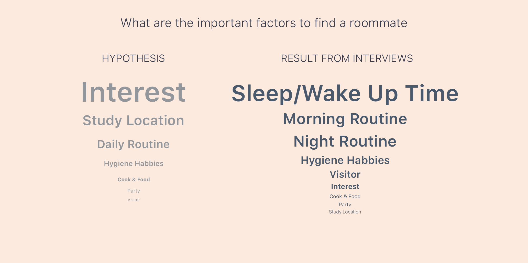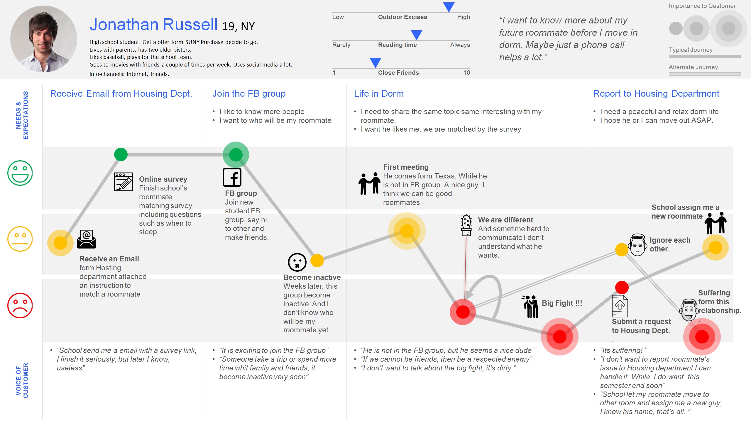 In our interview, they claimed that the insecurity sense mainly comes from the unpredictable future dorm life when living with a stranger, which directly results form current housing department matching approach. It is ture that the school gathered some information, what time to sleep and wake up, where is their favorite study location. Nevertheless, the students still complain that the roommates assigned by the school do not match the standards they submitted for selecting roommates. The students can't know what kind of person they will live with. Even though school creates a Facebook group for fresh students, however, in most of the scenarios, the group is usually inactive. Is there any other solution for helping students get more information before move in ?